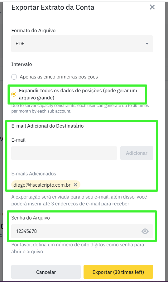 7. Selecione a opção “Expandir todos os dados de posições”, preencha com seu e-mail, coloque uma senha NUMÉRICA e clique em “exportar”: